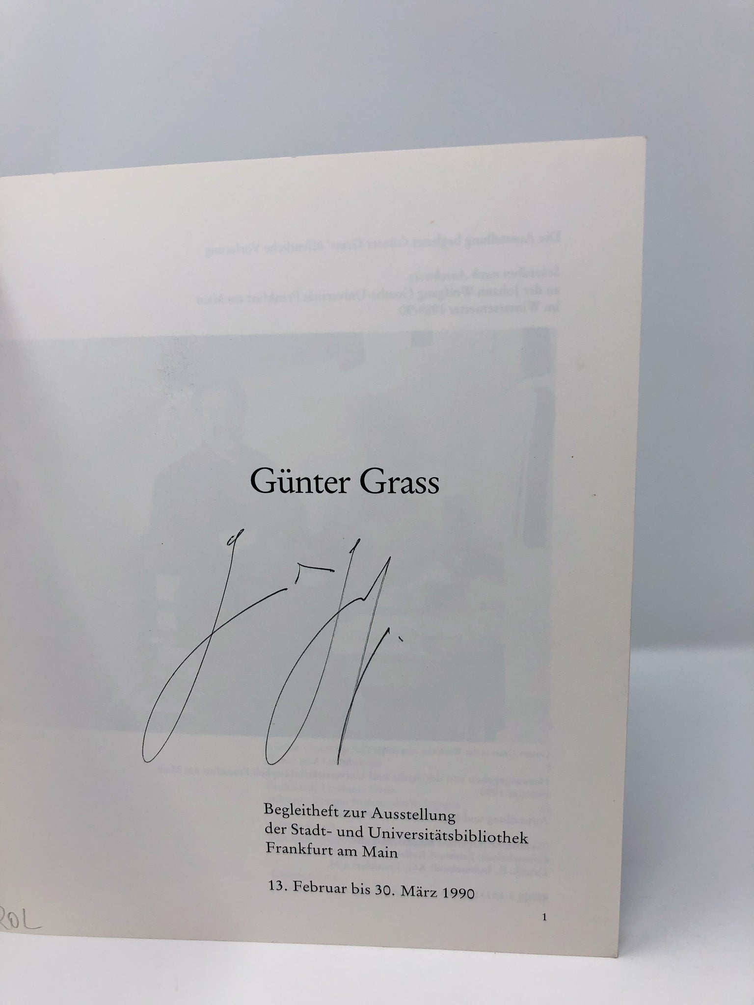 Begleitheft zur Ausstellung der Stadt- und Universitätsbibliothek Frankfurt am Main (Die Bibliothek: Frankfurt am Main, 1990). A softcover booklet to accompany an exhibition in Frankfurt. Featuring the 1985 Selbst mit Ratte self portrait on the the front. A few handling creases to the covers. Signed by Grass on the title page.