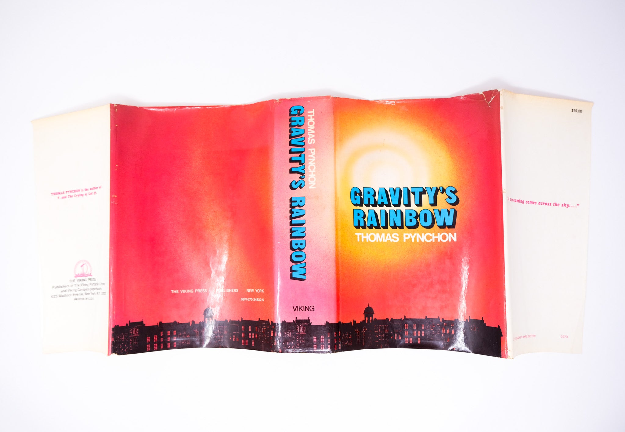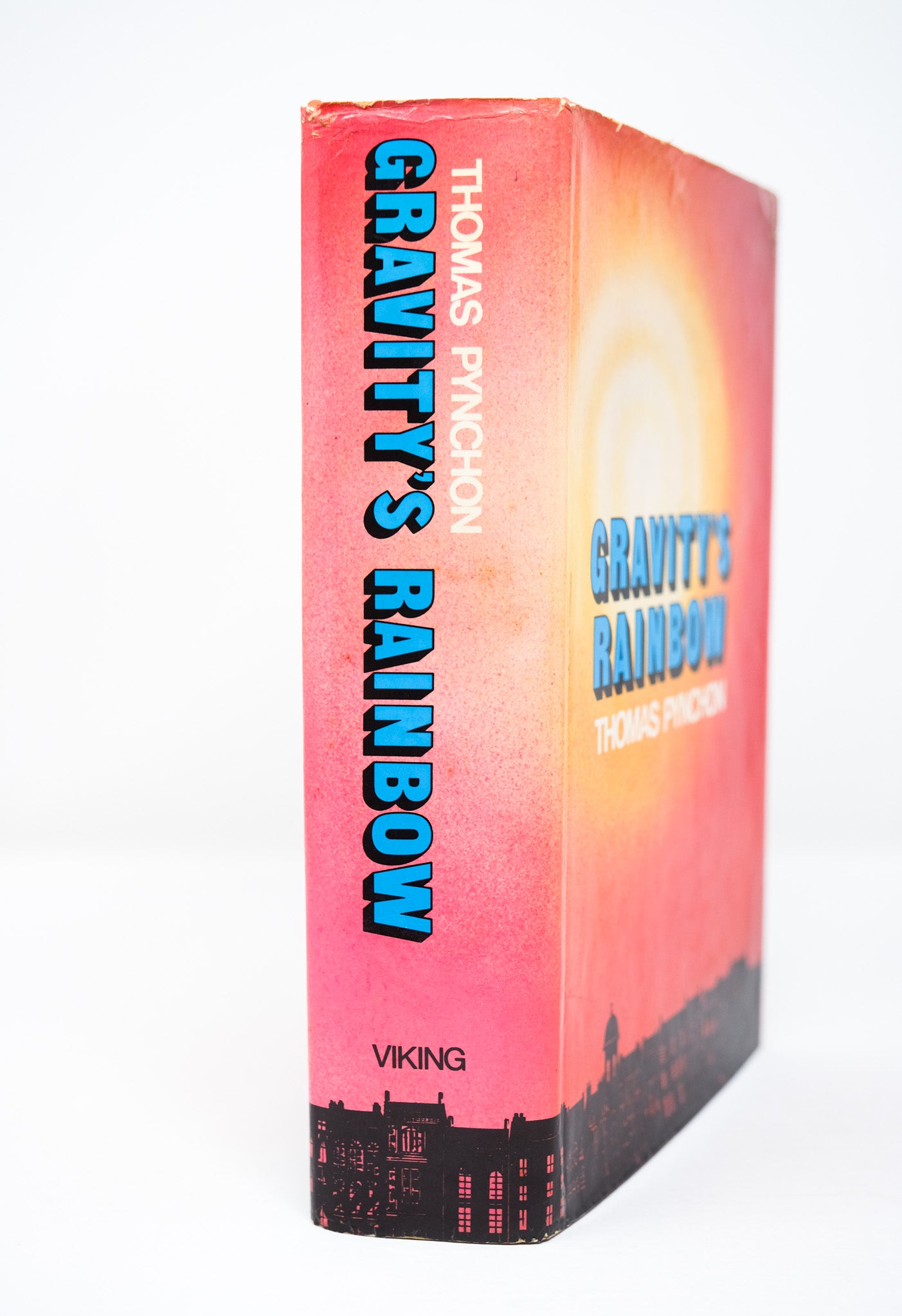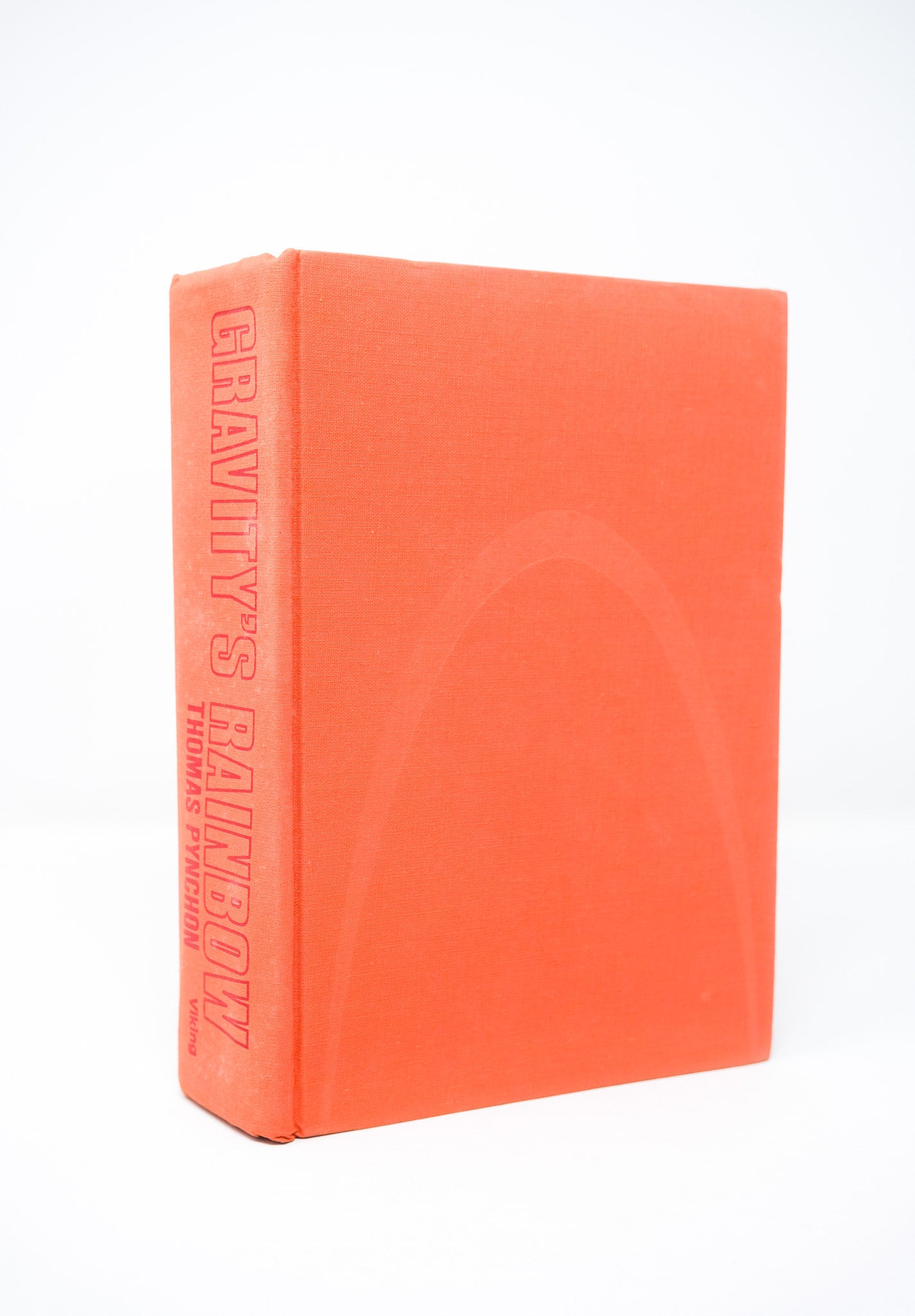 First edition. First printing. A sound, very good copy. Slight wear to the cloth. A previous owner’s bookplate to the front pastedown. Some foxing to the pastedowns and endpapers. The orange topstain a bit faded. A vertical crease on the half title page, extending with decreasing visibility to subsequent pages until pp. 30. A little mark to the fore-edge of the outer text block, but the contents fine. In a very good, unclipped dust jacket, with hardly any of the usual toning to the spine. Slight edgewear and a small closed tear at the top right corner of the front panel, with a discrete tape reinforcement at the verso. A very nice example in the bright dust jacket. Pynchon’s masterpiece, lauded as one of the greatest American novels.