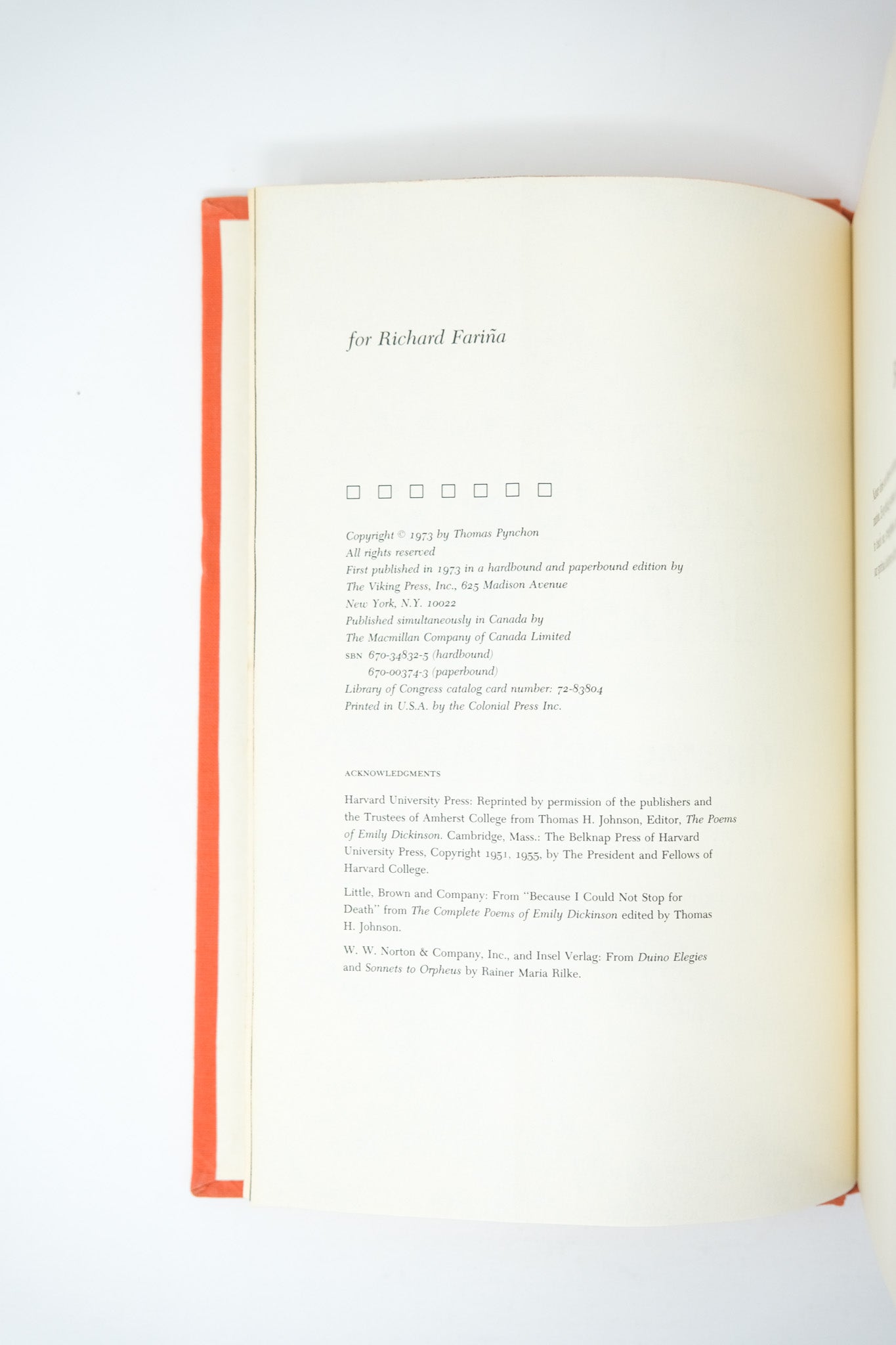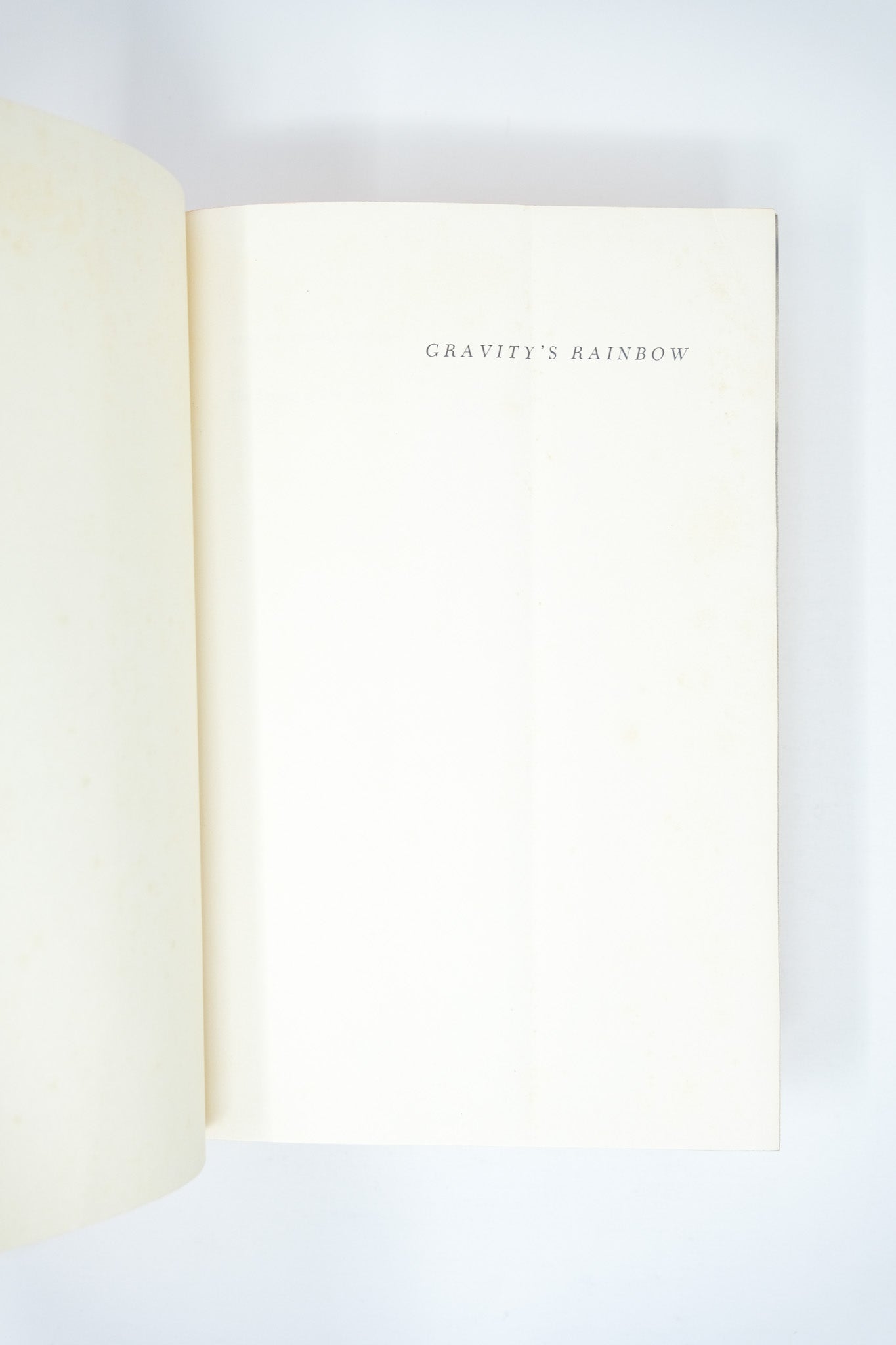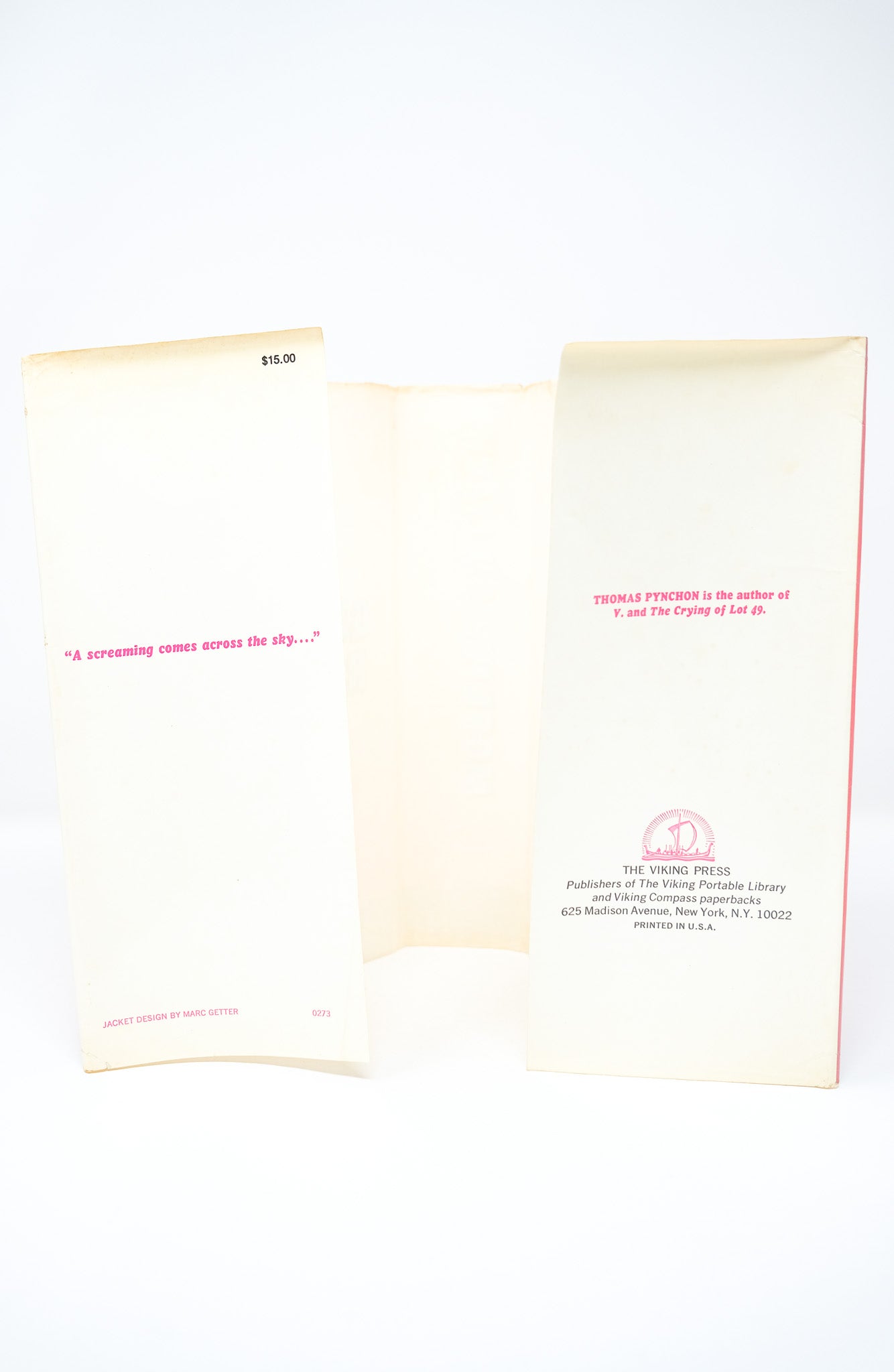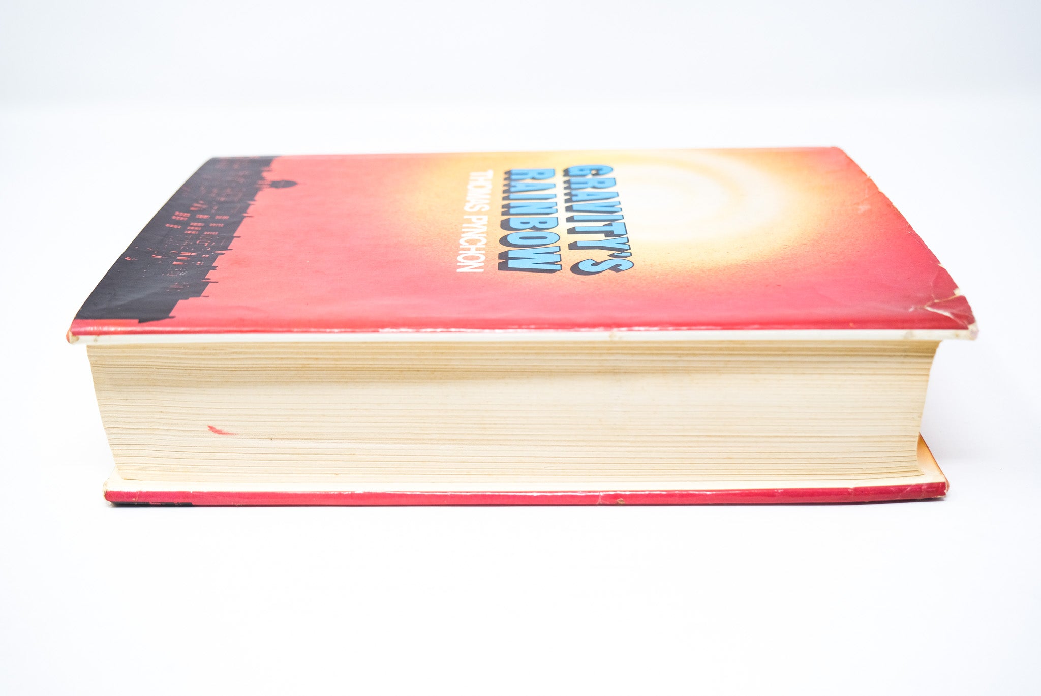First edition. First printing. A sound, very good copy. Slight wear to the cloth. A previous owner’s bookplate to the front pastedown. Some foxing to the pastedowns and endpapers. The orange topstain a bit faded. A vertical crease on the half title page, extending with decreasing visibility to subsequent pages until pp. 30. A little mark to the fore-edge of the outer text block, but the contents fine. In a very good, unclipped dust jacket, with hardly any of the usual toning to the spine. Slight edgewear and a small closed tear at the top right corner of the front panel, with a discrete tape reinforcement at the verso. A very nice example in the bright dust jacket. Pynchon’s masterpiece, lauded as one of the greatest American novels.