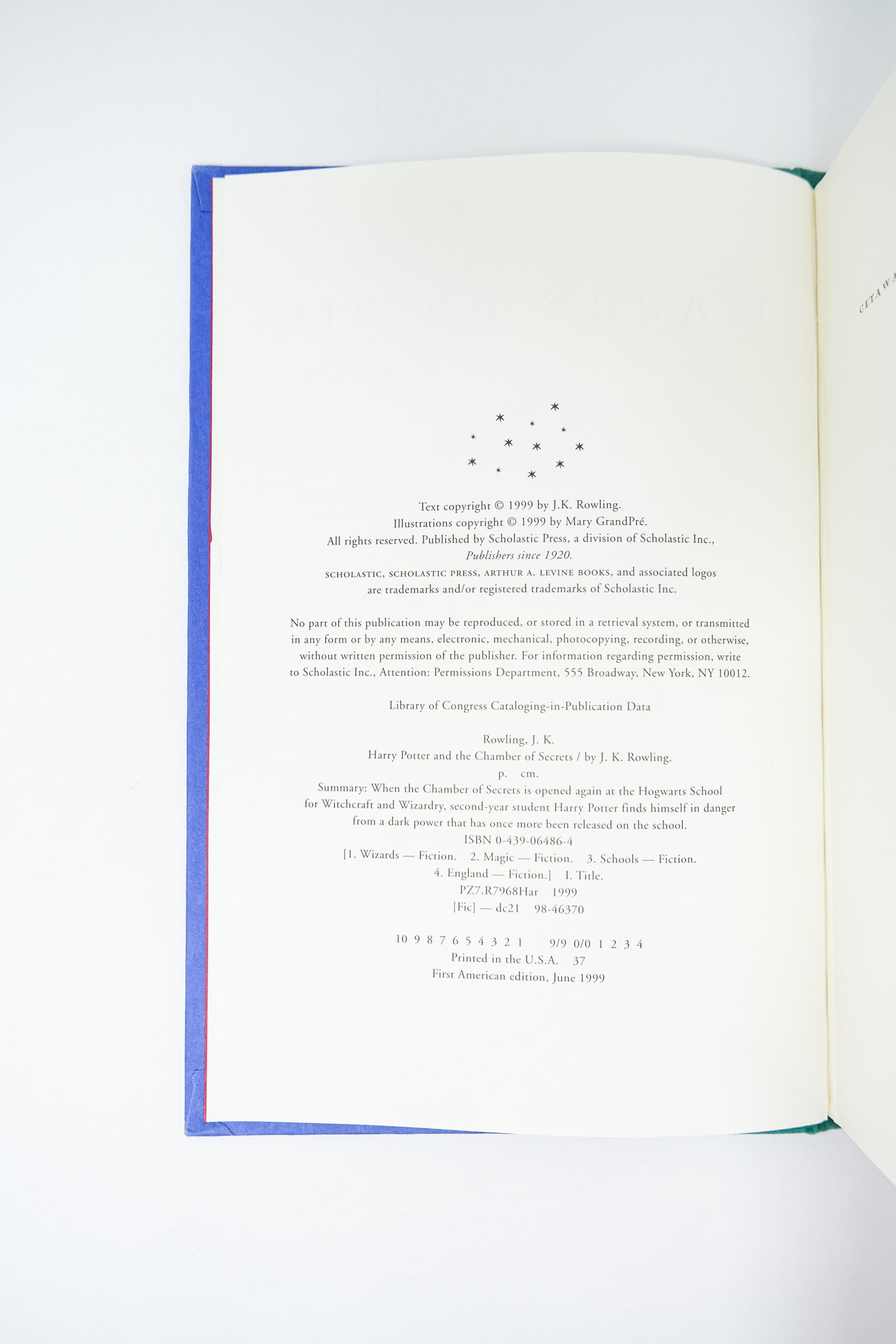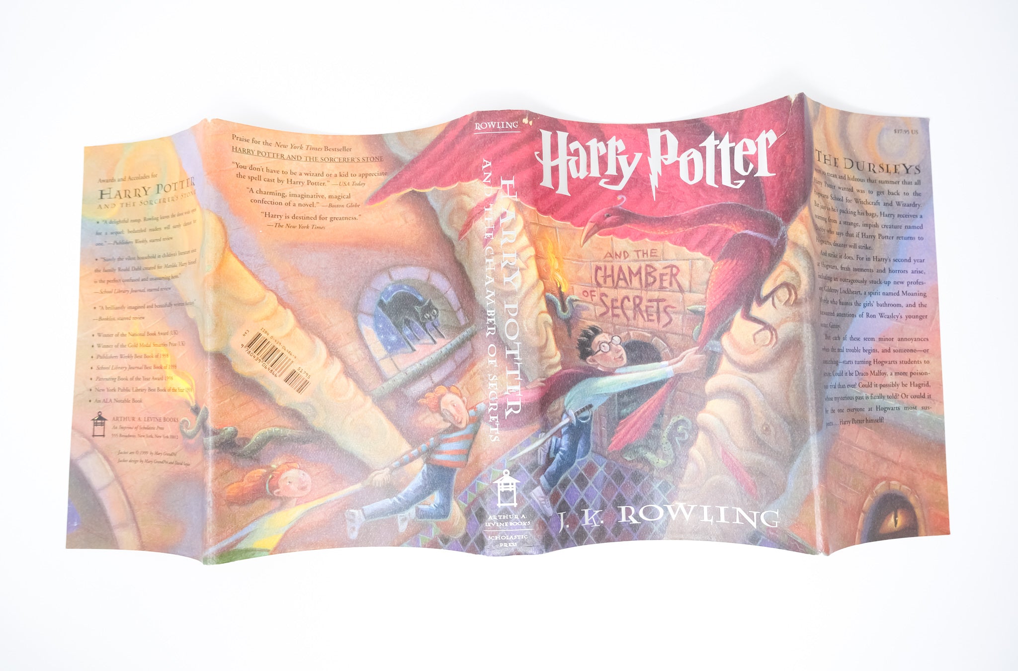 First edition. First printing. The slightest lean to the spine. A bit of foxing to the outer text block, but the contents fine. A couple of little nicks towards the crown of the jacket spine, as well as a crease to the top of the front panel and a one inch closed tear at the corner. A very good copy overall, in a very good unclipped dust jacket. The second book in the Harry Potter series to be released in the United States, following the unimaginable success of the Sorcerer’s Stone.