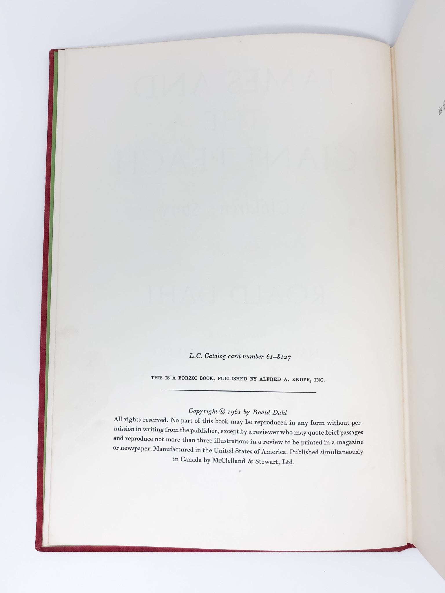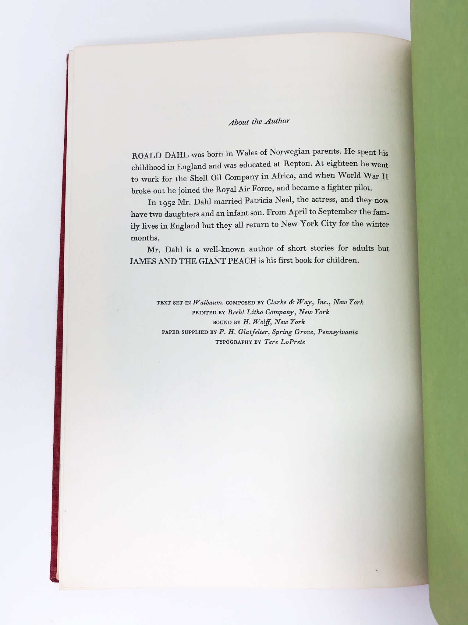 First edition. First issue, with the colophon stating “"Bound by H. Wolff, New York.” Inscribed by Dahl on the first free endpaper: “FOR CLARE / WITH / MORE / LOVE / Roald Dahl.” A very good copy. Boards with the bright red cloth, and the top edge of the text block yellow. Binding firm. Overall, bright and clean internally, though several pages slightly wrinkled with handling creases at the bottom. A closed tear at the bottom of page 19. No writings or marks, and the color plates in beautiful condition. Dahl's inscription showing a weakening felt tip towards the end, though undoubtedly permanent. The beautifully illustrated dust jacket, unclipped with the with the $3.95 on the front flap. A touch of loss to the head and heel of the spine, with little bits of wear and tear around the jacket. Verso unfoxed, and showing only a small smudge of red watercolor. A lovely copy, warmly inscribed by the author to the then six year old daughter of Arthur Ibbetson BSC, the cinematographer of Willy Wonka and the Chocolate Factory. Dahl had signed for her a copy of Charlie and the Chocolate Factory “with lots and lots and lots of love,” and as such the present book “with more love.” One of the most lasting and widely read children’s novels, uncommon in the first issue, and very scarce inscribed. A marvelous association copy, with two letters laid in establishing provenance.