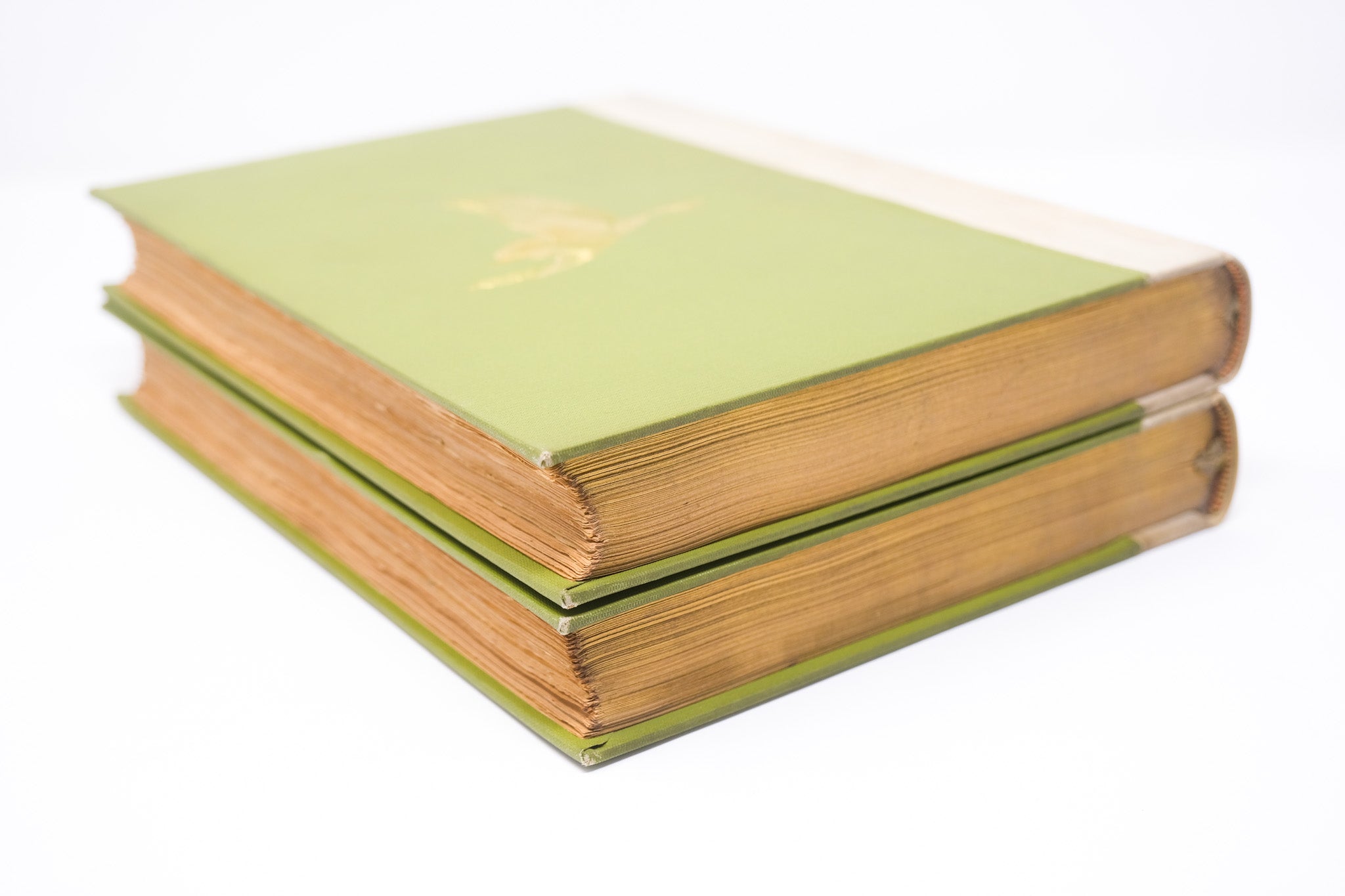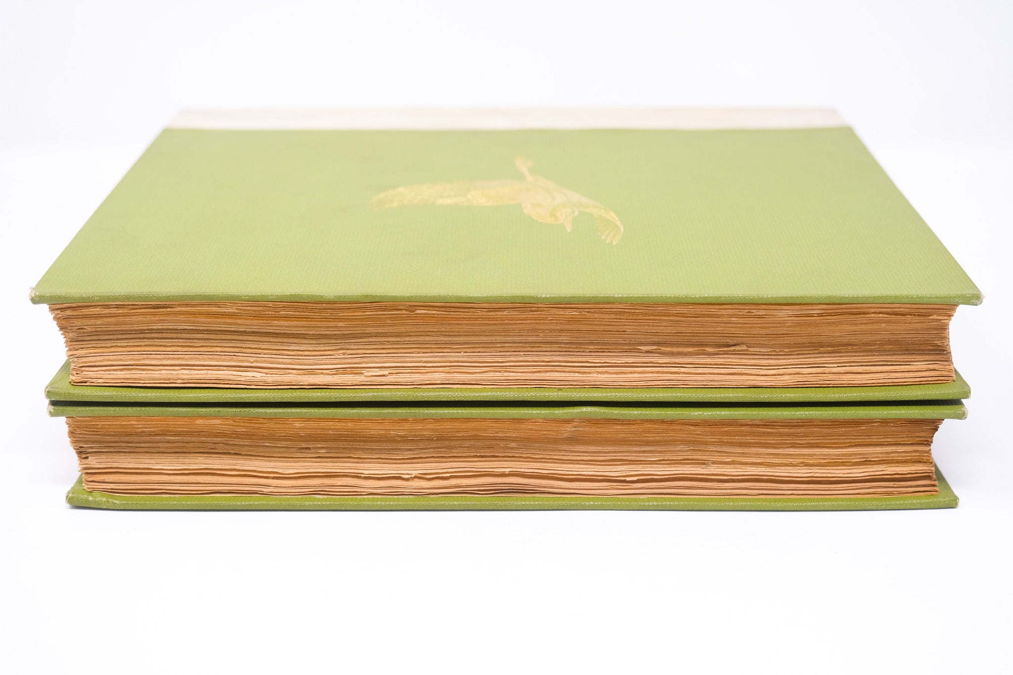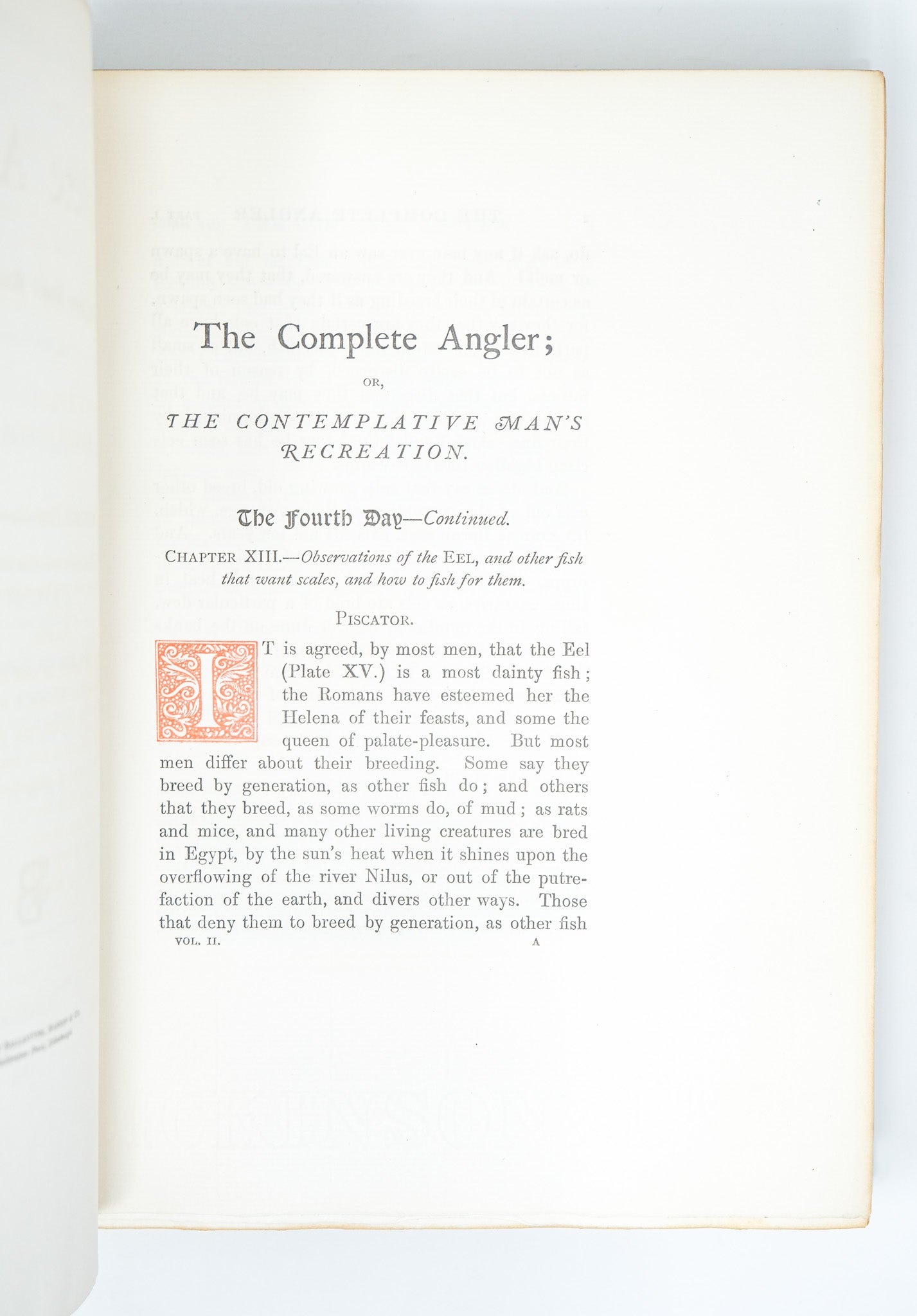 Tercentenary edition, limited to 350 numbered copies. Two volumes in white vellum over green cloth, with the top edges in gilt. Blank bookplates to the pastedowns. A small tear at the top of the rear free endpaper. Very slight wear to the vellum and bumping to the corners, but otherwise a near fine set. Engravings and printed illustrations throughout, with 32 plates on Japon paper. A very impressive production in homage to the 1653 original, and a testament to the enduring popularity of Walton’s work over centuries. The foundational text of angling literature, long celebrated as both a practical and philosophical guide to the sport, promoting harmony between man and the natural word.
