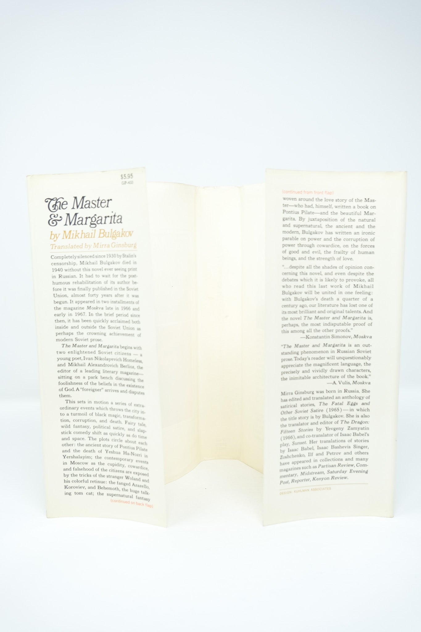 First American edition. The first appearance of The Master & Margarita in the United States, preceding the Harper and Row edition. A near fine copy, just with some foxing to the fore-edge of the outer text block. The faintest foxing to the pastedowns and endpapers but the contents otherwise flawless. In a near fine, unclipped dust jacket, with a tiny nick on the spine and the slightest bit of rubbing at the extremities. An uncommonly beautiful example still. The story of the Devil’s visit to Moscow, in an atheistic Soviet Union. It is Bulgakov’s masterpiece, and arguably the greatest work of 20th Century Russian literature.