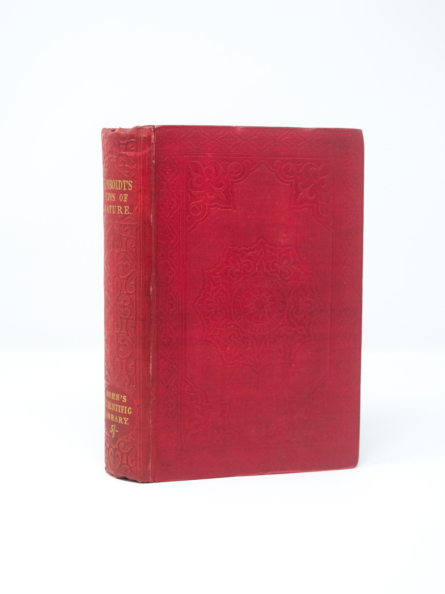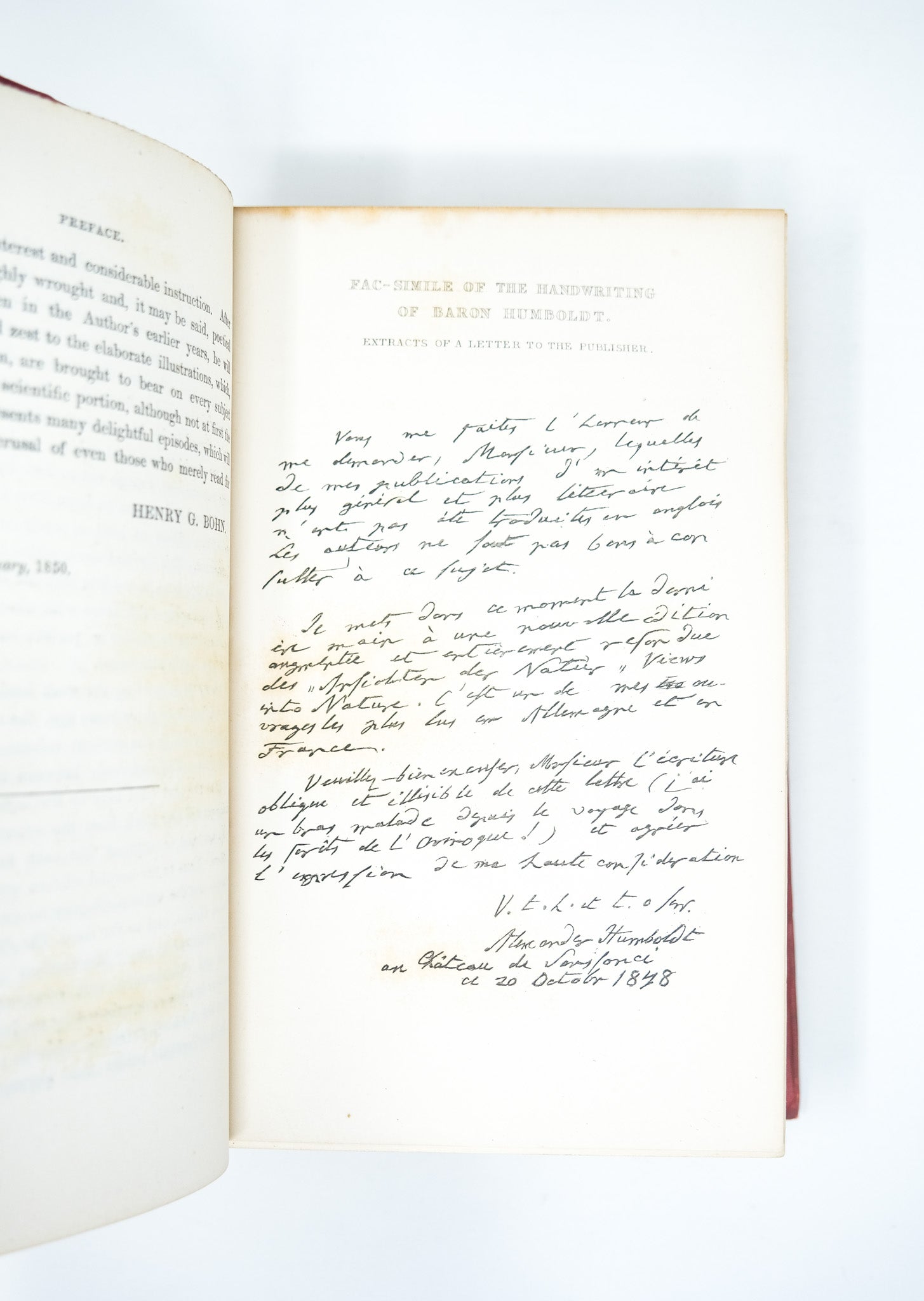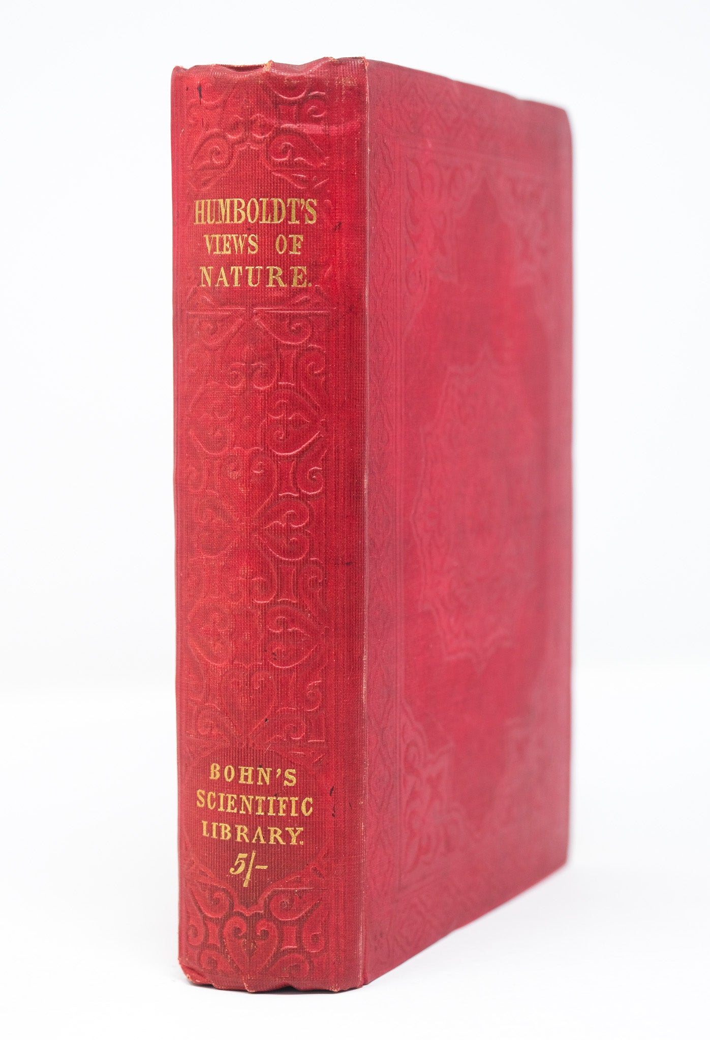 First English edition. In the publisher’s original red cloth. Complete with the colored frontispiece from a sketch by Humboldt, depicting Chimborazo, and the facsimile of his handwriting. A very good to near fine copy, remarkably sound with minimal wear and no loss to the spine. The pages slightly cockled, and some foxing mainly to the preliminaries. The contents otherwise crisp and clean. An uncommonly nice example of this collection of observations by the legendary polymath, written shortly after his return from South America. An early landmark in nature writing, in which Humboldt bridges literary and scientific sensibilities to relate his understanding of the natural world. This work would influence many writers and thinkers, including Thoreau, Darwin, and von Goethe.