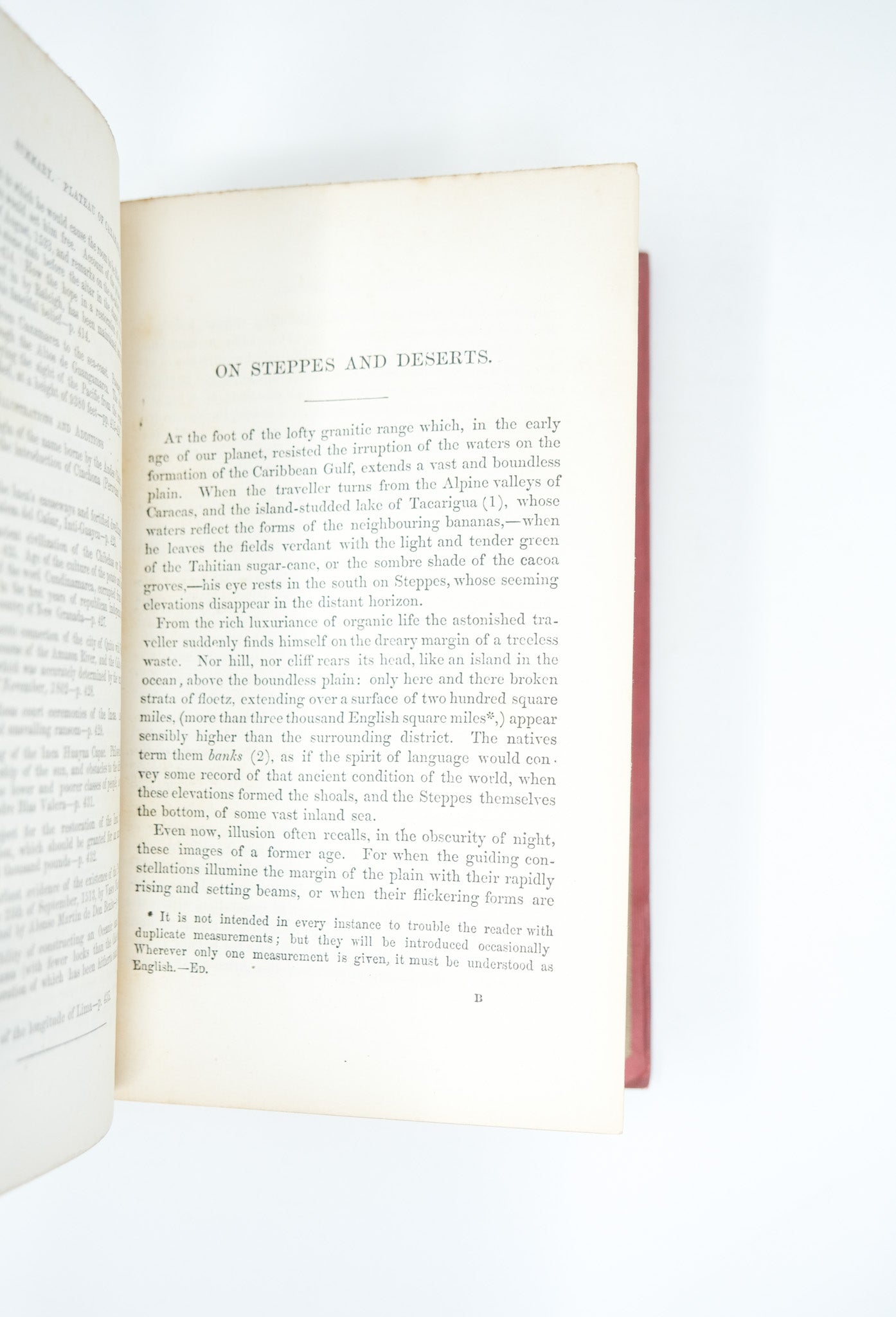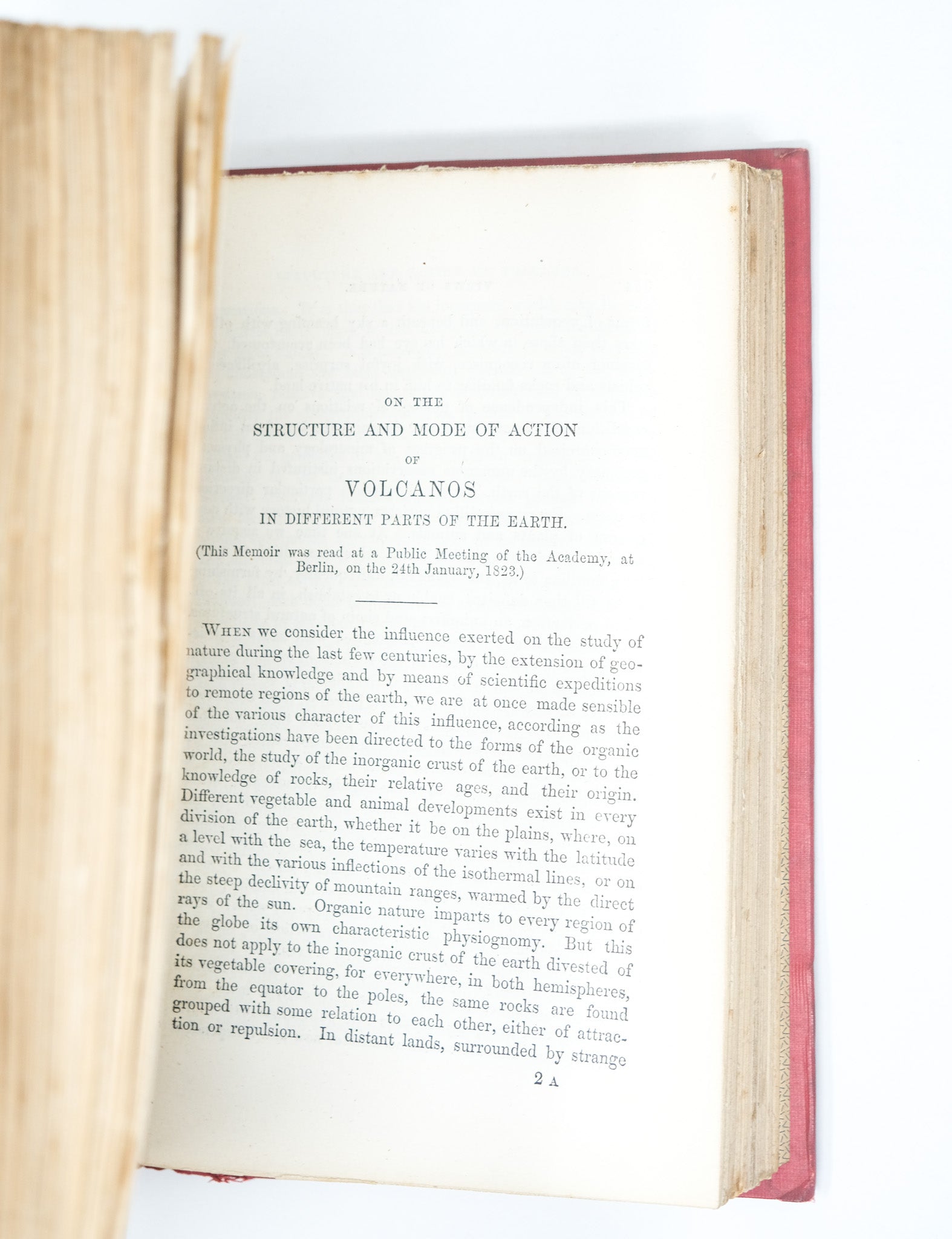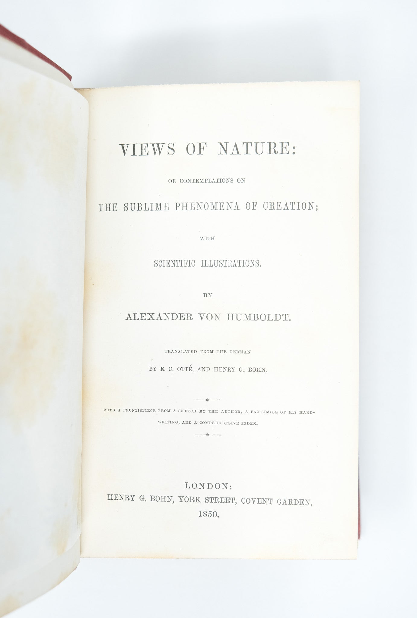 First English edition. In the publisher’s original red cloth. Complete with the colored frontispiece from a sketch by Humboldt, depicting Chimborazo, and the facsimile of his handwriting. A very good to near fine copy, remarkably sound with minimal wear and no loss to the spine. The pages slightly cockled, and some foxing mainly to the preliminaries. The contents otherwise crisp and clean. An uncommonly nice example of this collection of observations by the legendary polymath, written shortly after his return from South America. An early landmark in nature writing, in which Humboldt bridges literary and scientific sensibilities to relate his understanding of the natural world. This work would influence many writers and thinkers, including Thoreau, Darwin, and von Goethe.