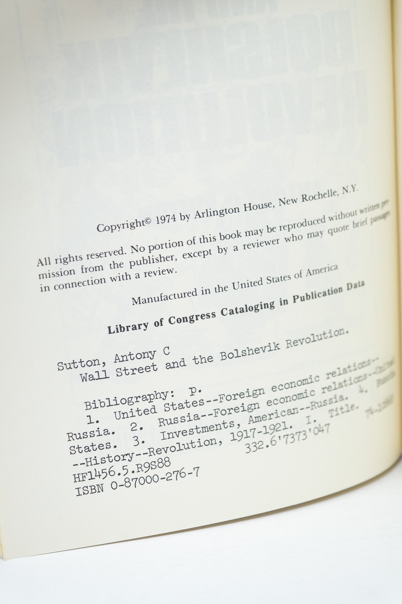First edition. A very good copy. Some bumping to the boards, and foxing to the outer text block, not affecting the contents. In a very good dust jacket, slightly worn and with a crease along the rear flap and a trace of damp stain to the verso. Most presentable still. The first book - and the scarcest - of Sutton’s controversial Wall Street trilogy, and a classic in conspiracy theory literature. Sutton reanalyzes some of the most monumental political events of the 20th Century, asserting that they were backed and shaped by an amoral financial elite.